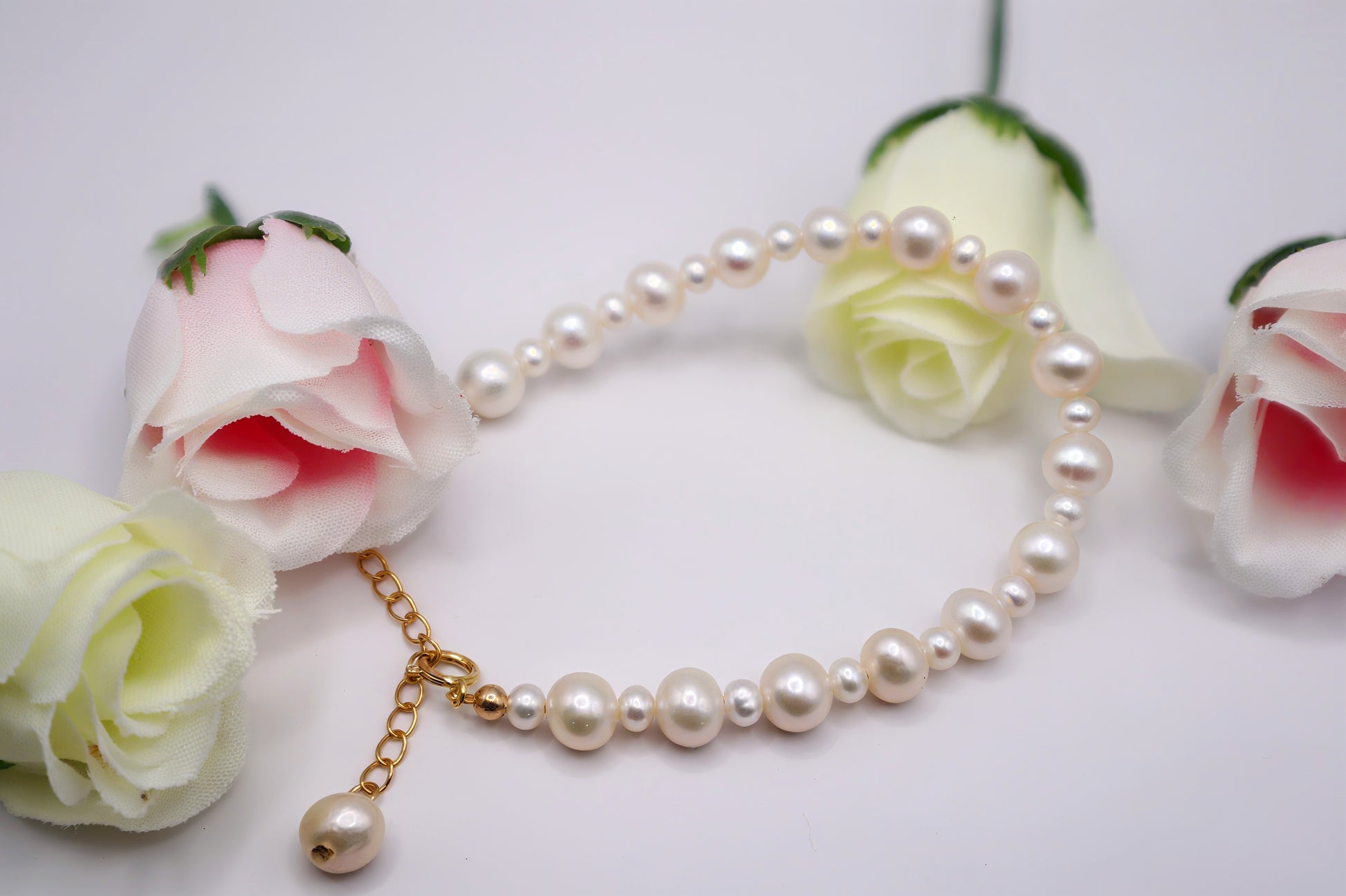 Delicate and timeless, this bracelet features a graceful strand of 3–6mm round white freshwater pearls, each one naturally unique and softly luminous. The pearls are strung on a 14K gold-plated chain, blending warm tones with classic elegance.