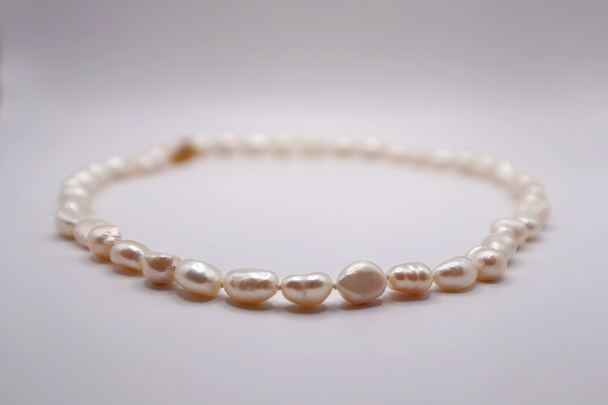 Bold yet effortlessly refined, this necklace features a single 8–9mm white baroque freshwater pearl—celebrated for its organic shape and natural luster. No two pearls are exactly alike, making each piece beautifully unique.