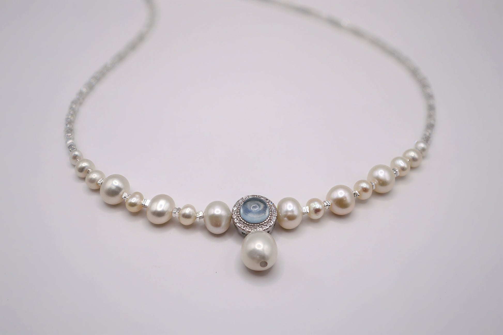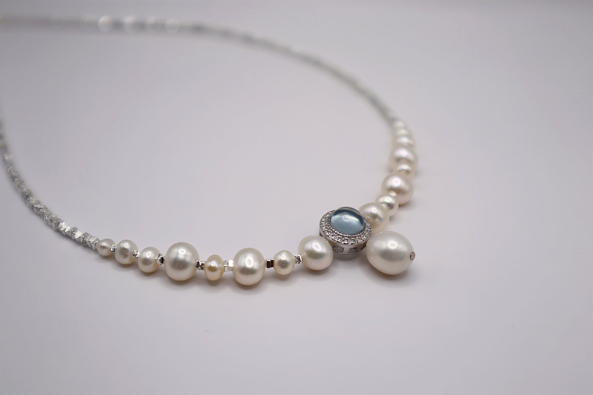 Refined and radiant, this necklace brings together natural elegance and timeless design. Hand-strung with a graceful mix of 4–6mm and 8–9mm white freshwater pearls in both round and rice shapes, each pearl offers its own soft glow and organic beauty.